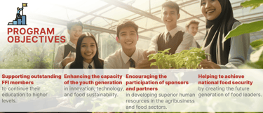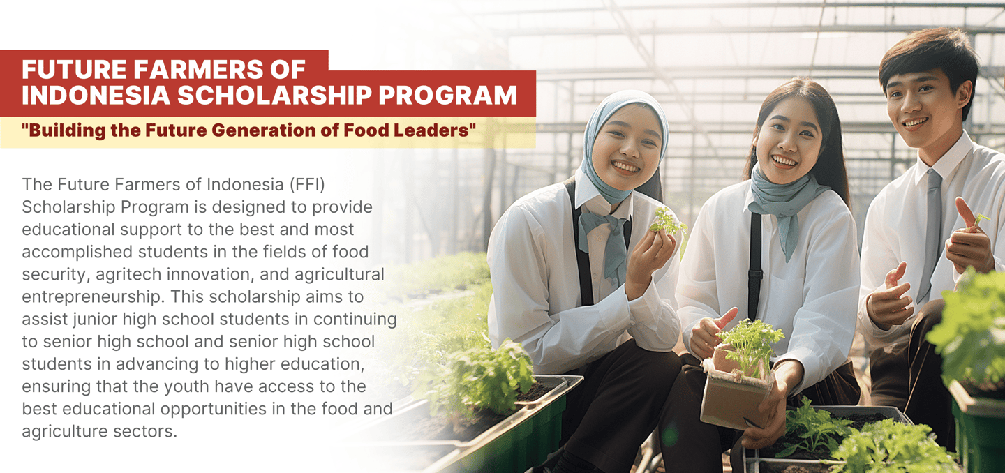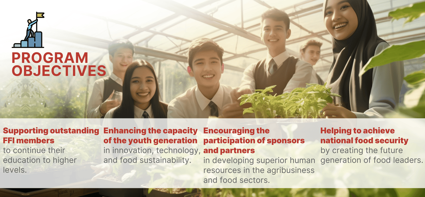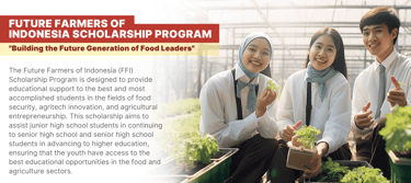 This scholarship is supported by sponsors from FFI’s partner network, including agribusiness companies, state-owned enterprises (SOEs), food organizations, and educational institutions.